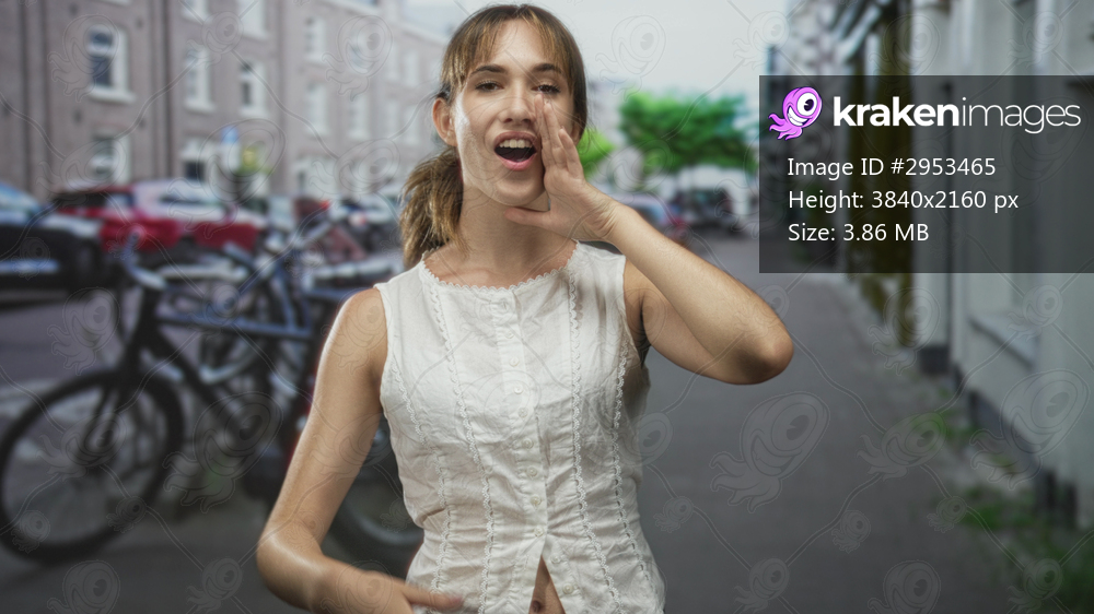 Woman cupping hand to mouth shouting on a city street with bicycles and row houses visible; urgent communication.