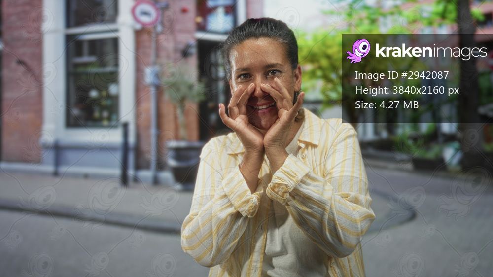 Woman cupping hands around mouth calling on street in front of brick building wearing striped shirt; urgent announcement.