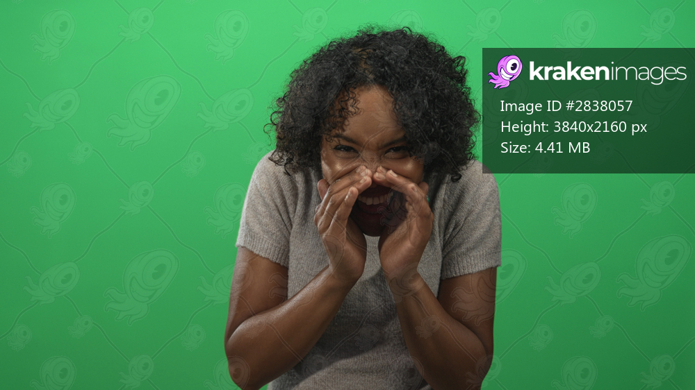 Woman cupping hands around mouth in studio setting with bright green background; attention excitement.