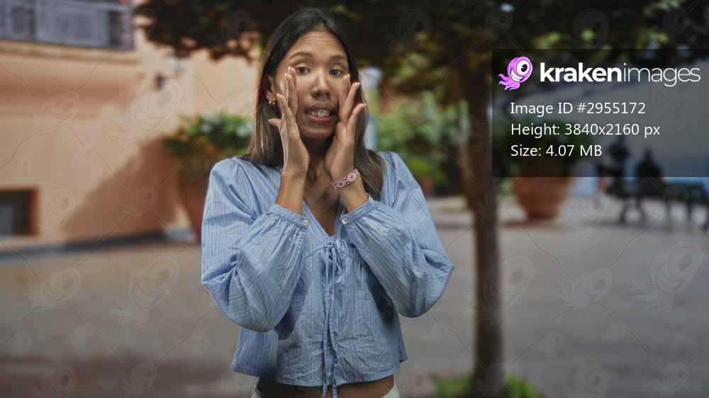 Woman cupping hands at mouth calling near building plaza with bench and plant visible, wearing blue blouse; surprise curiosity alert.