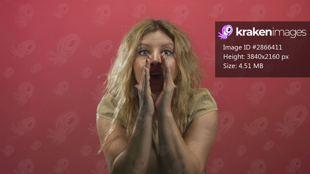 Woman cupping hands to mouth facing camera in studio with pink backdrop and tousled blonde hair; excitement energy.