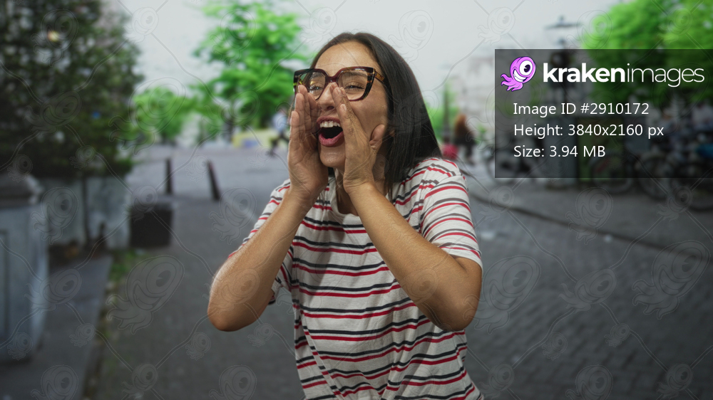 Woman cupping hands to mouth on busy city street calling out to passersby and laughing loudly; joy celebration.