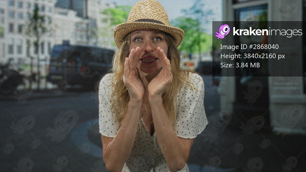 Woman cupping hands to mouth on city street, straw hat and polka dot blouse, leaning forward while whispering; secrecy gossip.
