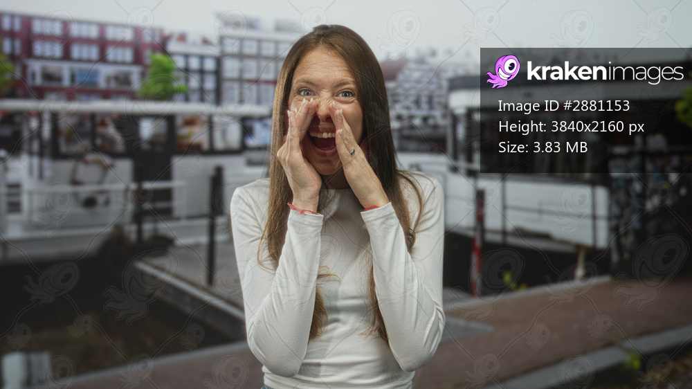 Woman cupping hands to mouth on street in amsterdam with animated expression and open mouth, hands raised in calling gesture; excitement celebration.