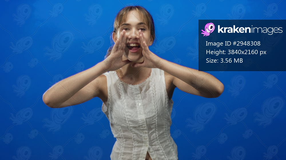 Woman cupping hands to mouth shouting in a blue studio wearing a white sleeveless top and smiling; enthusiasm communication.