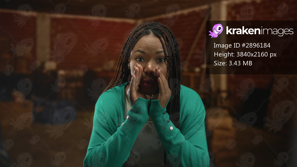 Woman cupping hands to mouth shouting in building with exposed brick and boxes indoors; community alert urgency.