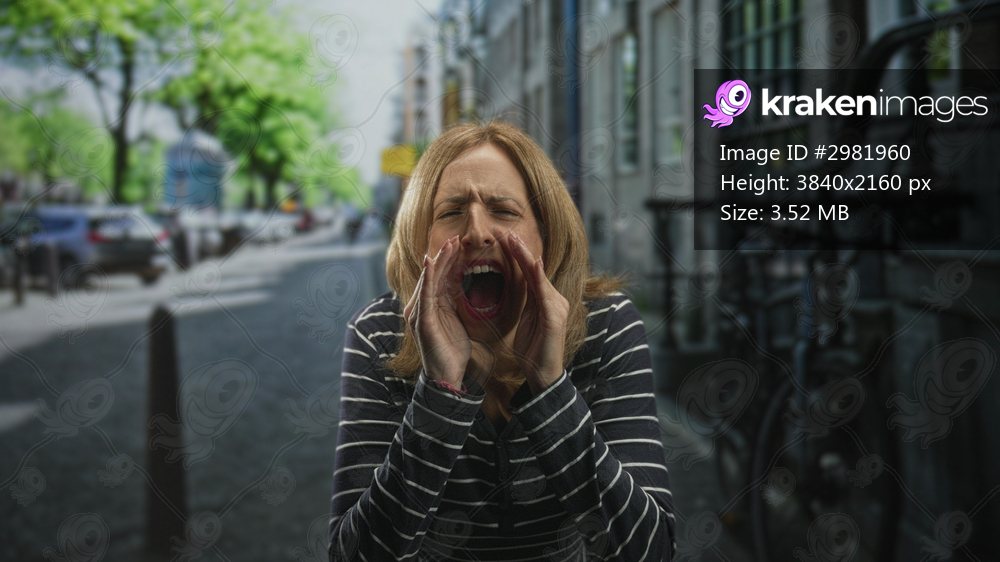 Woman cupping hands to mouth shouting on a busy city street near parked bicycles; urgent alert panic.