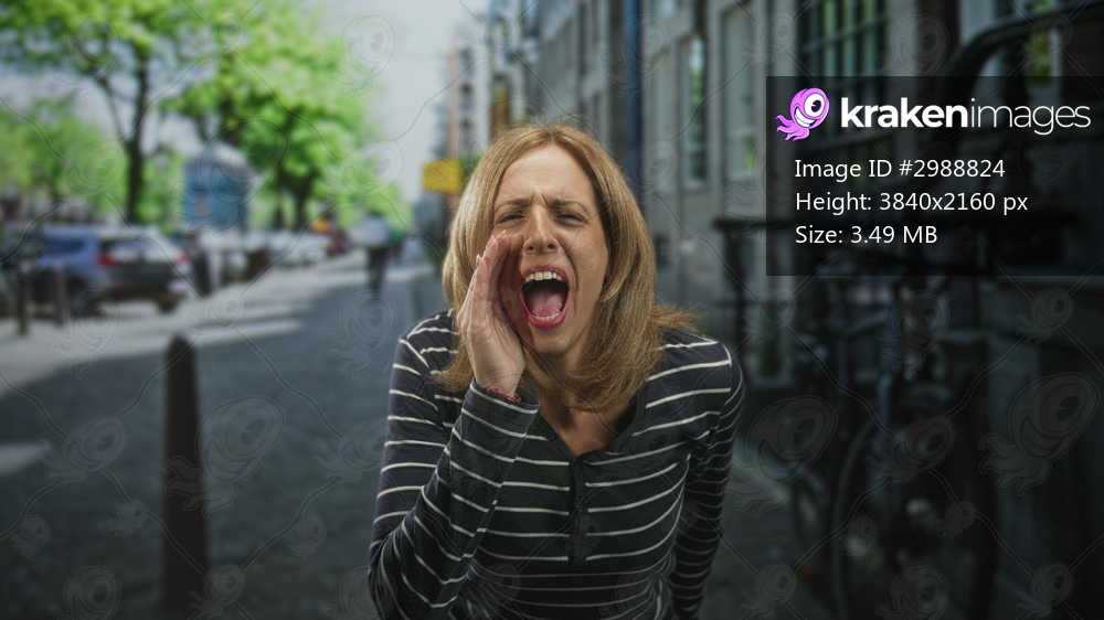 Woman cupping hands to mouth shouting on a busy city street near parked bicycles; urgent alert panic.