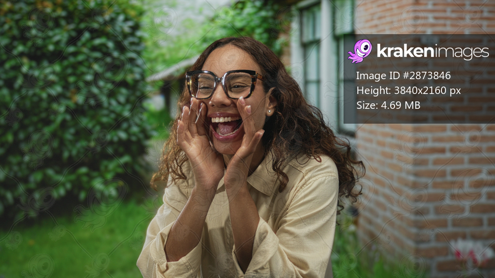 Woman cupping hands to mouth while shouting and laughing at a house entrance beside brick wall and green hedge; joy celebration.