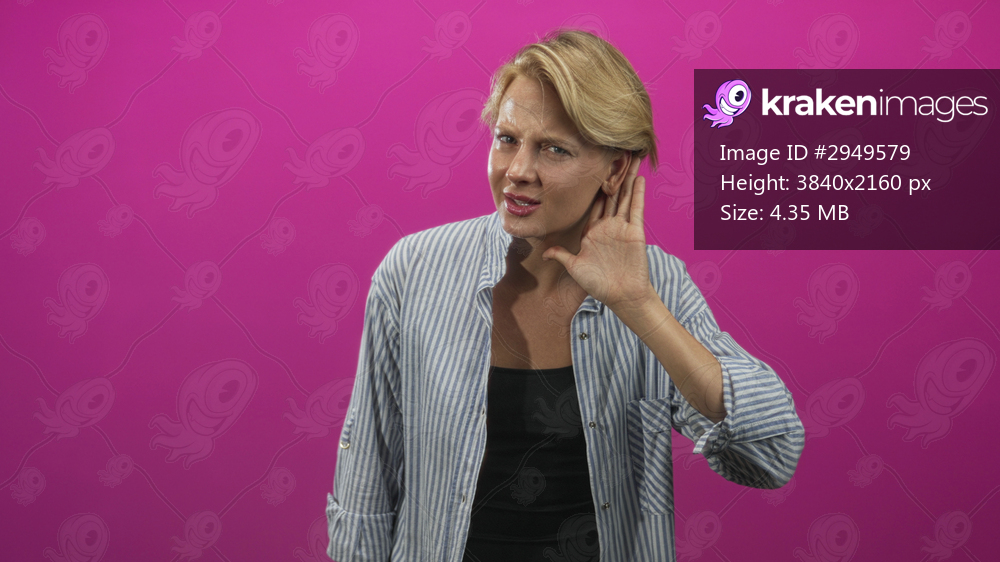 Woman cupping her hand to ear in listening gesture, striped shirt and black tanktop visible, midframe portrait with pink studio backdrop and repeated frames; curiosity. - Kraken Images