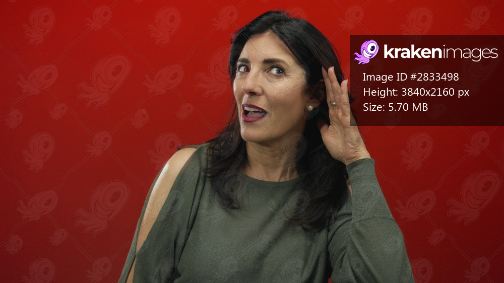 Woman cupping her right ear and leaning forward in studio with bright red background to hear faint sound clearly; curiosity.