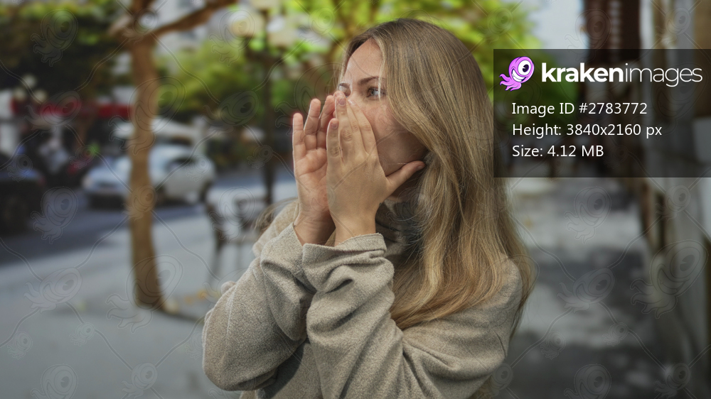 Woman cups both hands around mouth shouting on street amid blurred trees and parked cars under bright daylight; alert communication announcement attention. - Kraken Images
