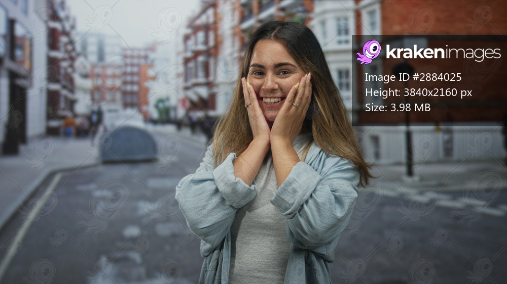 Woman cups cheeks with both hands while smiling, showing rings and yellow nails on a busy city street near brick buildings; joy playfulness.