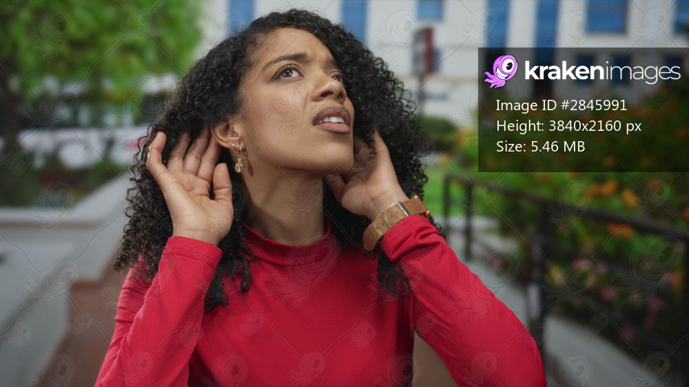 Woman cups ear with both hands on city street near railings and foliage while gazing upward in red shirt; curiosity.