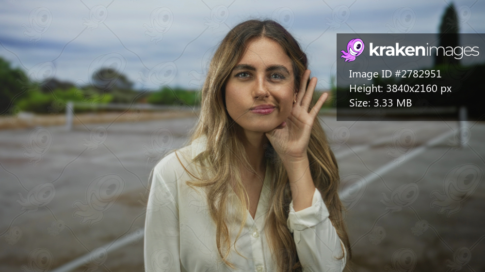 Woman cups hand to ear listening on tennis court; curiosity attention.