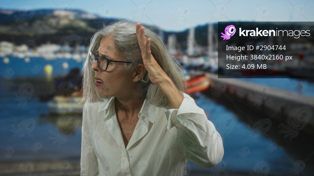 Woman cups hand to ear on a street harbor pier with moored boats and yachts, grimacing as she strains to hear; confusion.