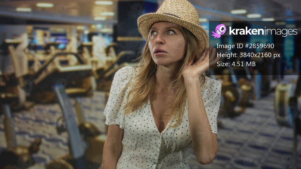 Woman cups hand to ear while wearing straw hat and polka dot blouse in gym building among cardio machines; curiosity attentive focus.