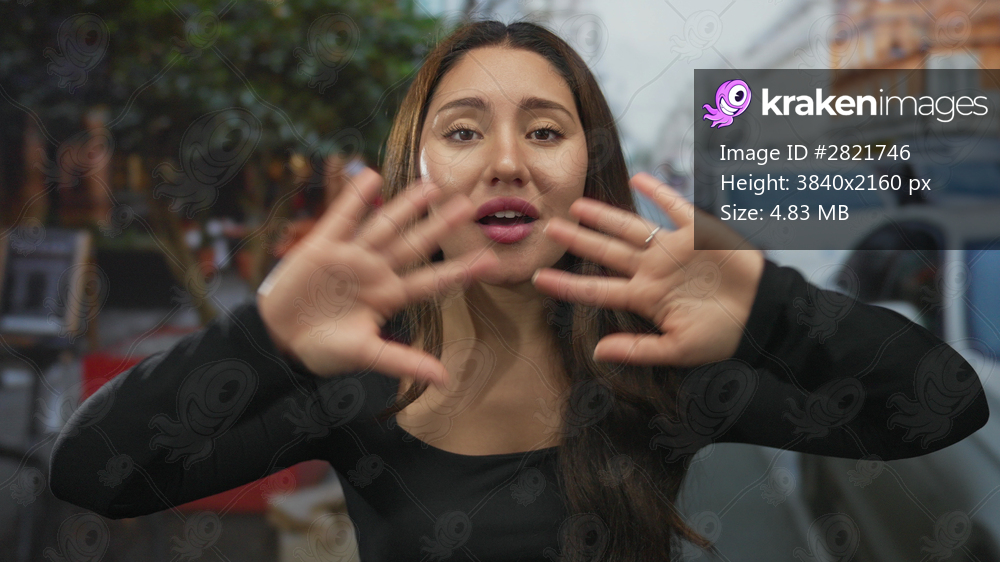 Woman cups hands around mouth on city street beside parked cars calling out to crowd under urban storefronts; urgency.