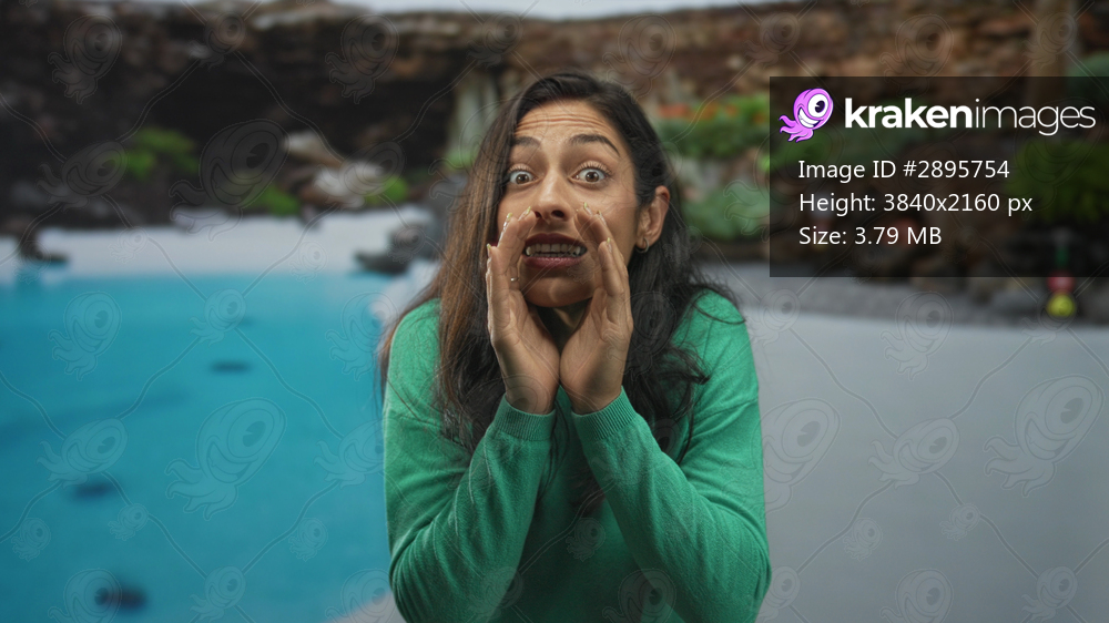 Woman cups hands to mouth calling across a hotel pool at a resort outdoors with visible face and hands in frame; urgency.