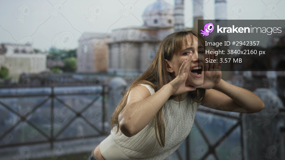 Woman cups hands to mouth shouting at roman building ruins on outdoor terrace; frustration defiance protest.