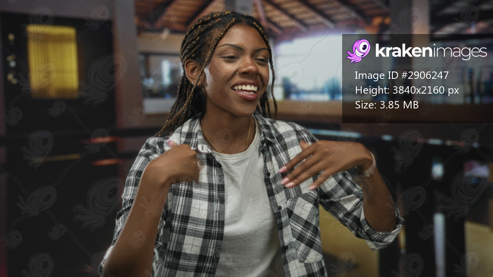 Woman cups hands to mouth while shouting in hotel building and gestures to chest, wearing plaid shirt and bracelet; friendly excitement.