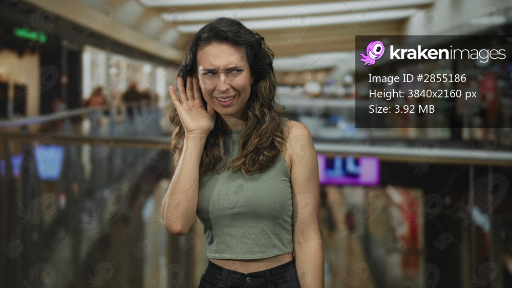 Woman cups her ear with her hand while squinting in a busy indoor shopping mall building; curiosity.