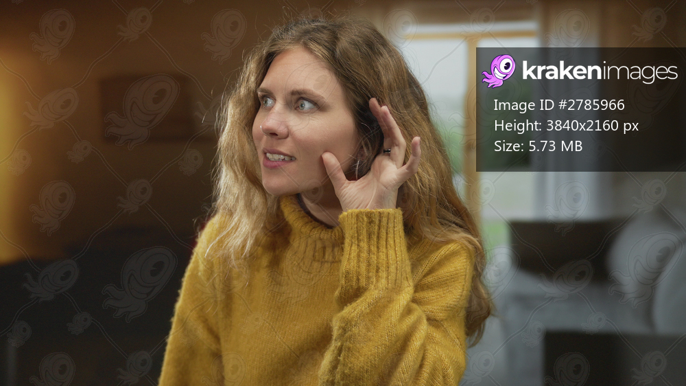 Woman cups her ear while listening in an interior space, blonde young figure raising a hand with a smile and subtle gesture indoor.