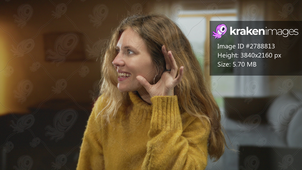 Woman cups her ear while listening in an interior space, blonde young figure raising a hand with a smile and subtle gesture indoor.