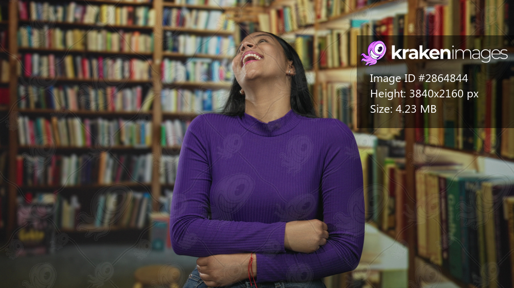 Woman cups her hand to mouth while laughing beside a tall bookshelf in a library building; amusement joy.