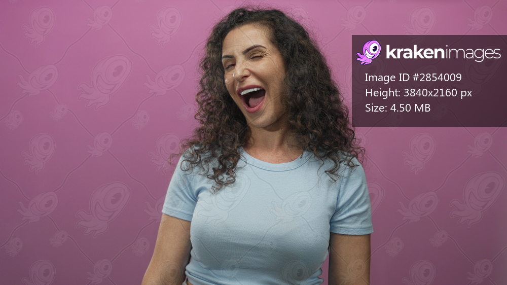 Woman with curly brown hair wearing blue shirt winks in pink studio with soft ringlet locks framing her face; playfulness.
