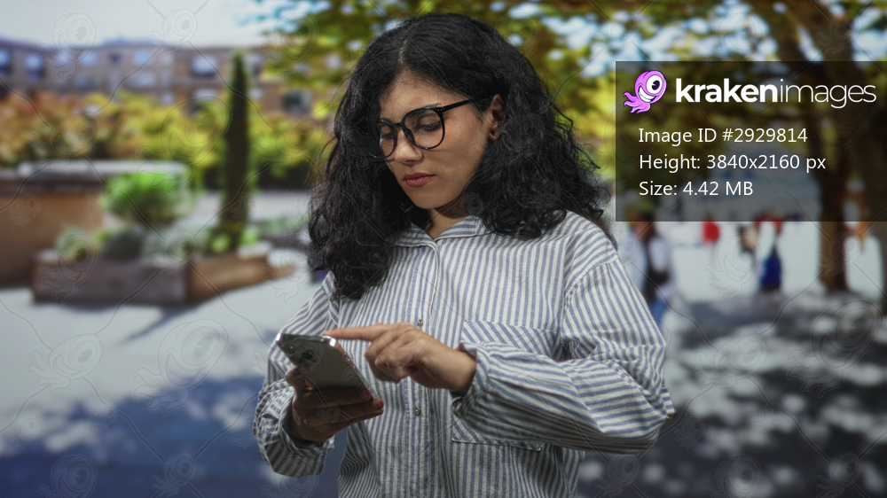 Woman with curly dark hair and round glasses tapping smartphone on street near trees and plaza bench; concentration.