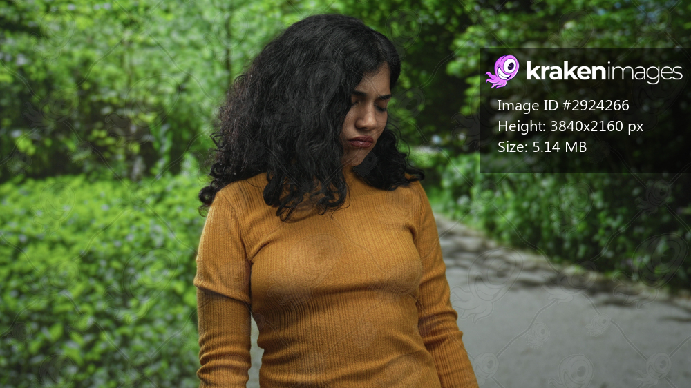 Woman with curly dark hair and visible face showing pensive expression and slight smile while standing on park path wearing mustard sweater; quiet contemplation. - Kraken Images