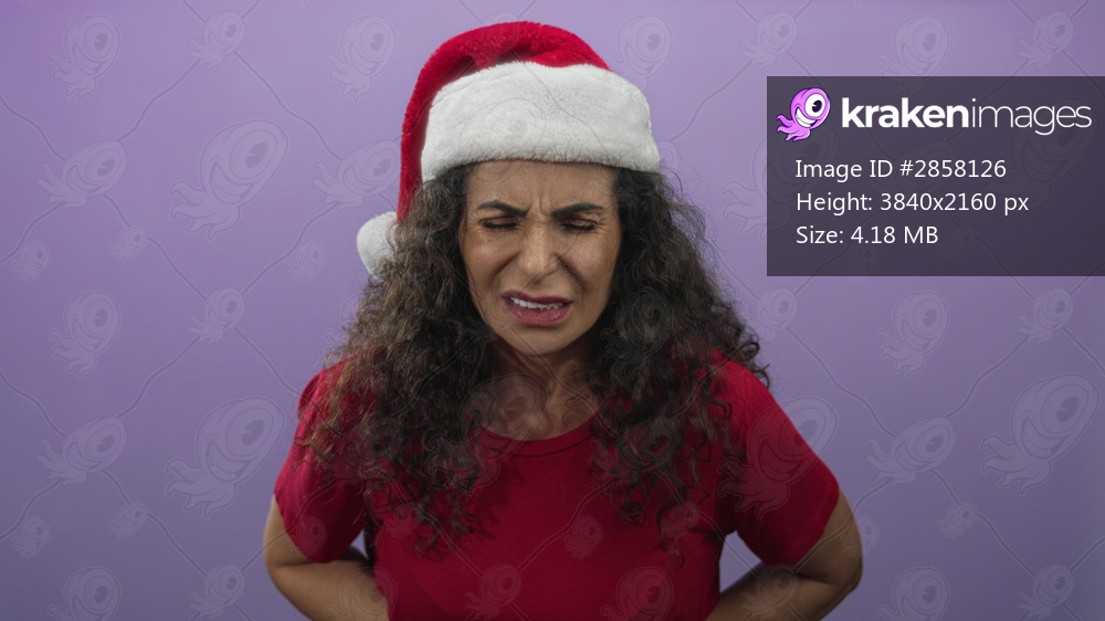 Woman with curly dark hair wearing santa hat and red shirt clutching stomach and wincing in purple studio; discomfort.