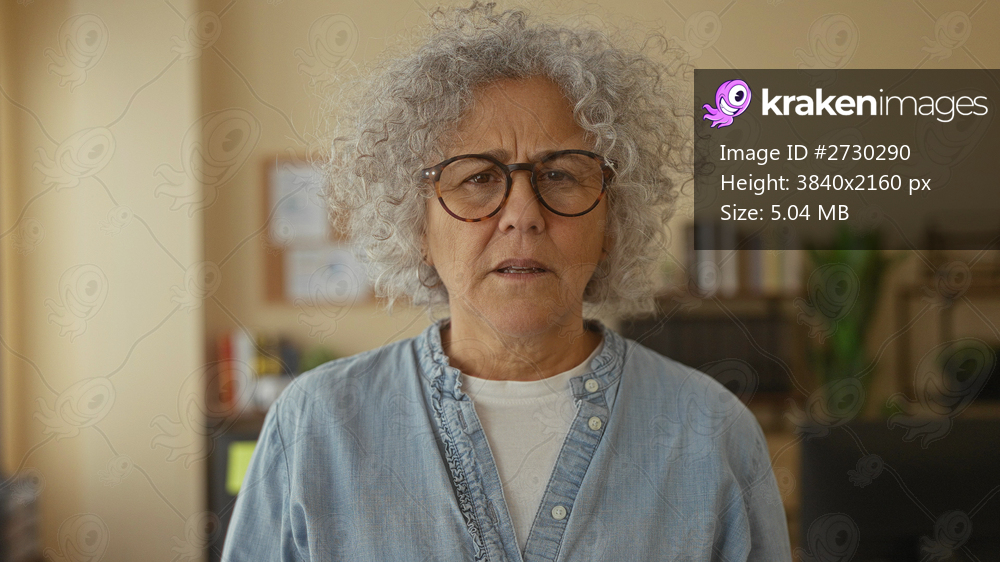 Woman with curly grey hair and glasses in an office setting expresses thoughtfulness through hand gestures, clad in casual attire amidst a blurred indoor backdrop of books and plants. - Kraken Images