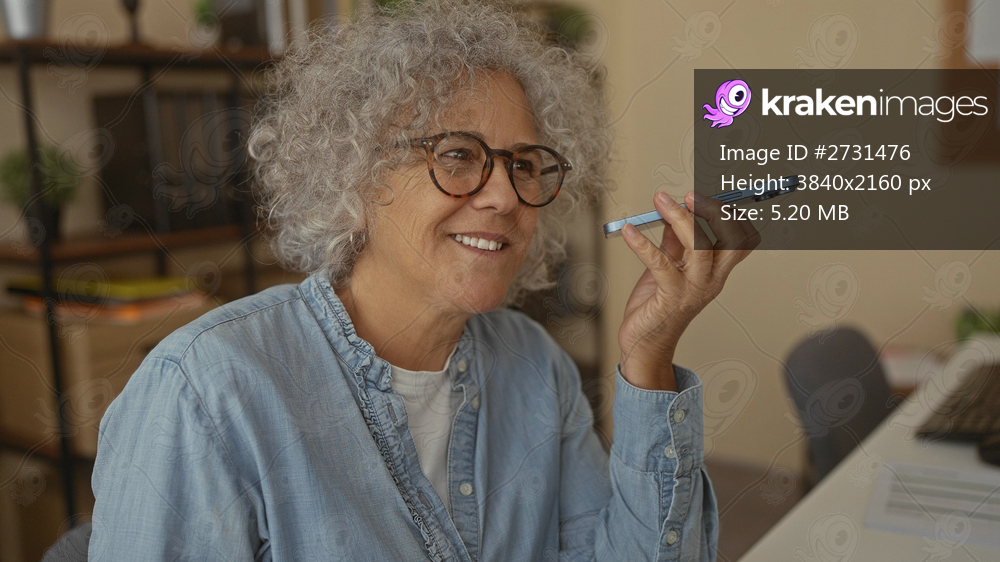 Woman with curly grey hair and glasses speaking into smartphone sitting in modern office environment suggests professional communication and work engagement. - Kraken Images