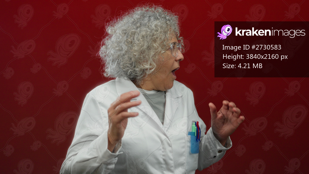 Woman with curly grey hair in a white lab coat against a red wall looks sideways, conveying professionalism and attention.