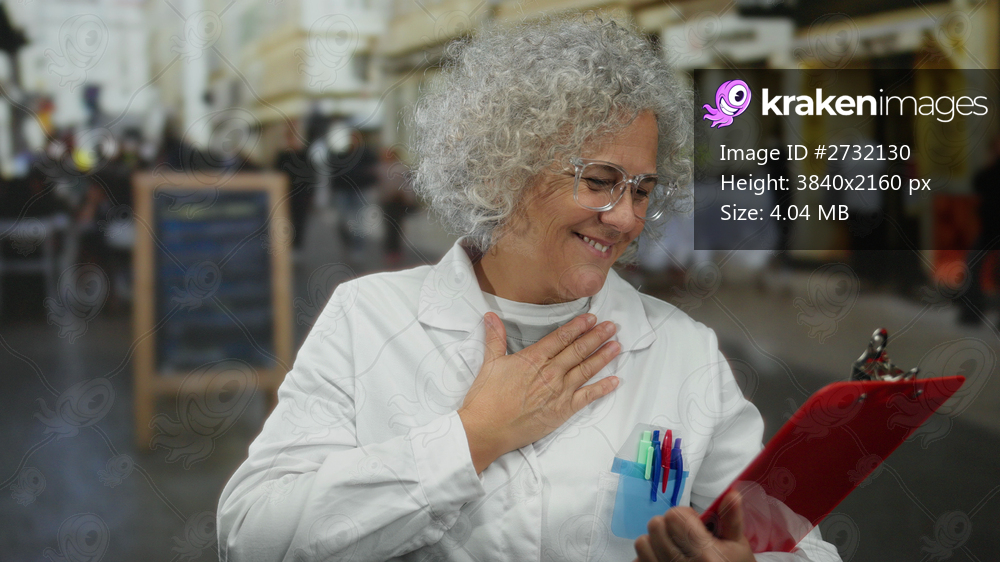 Woman with curly grey hair smiles while holding a clipboard in an outdoor restaurant setting, wearing a white coat with pens in her pocket, surrounded by blurred street scene. - Kraken Images