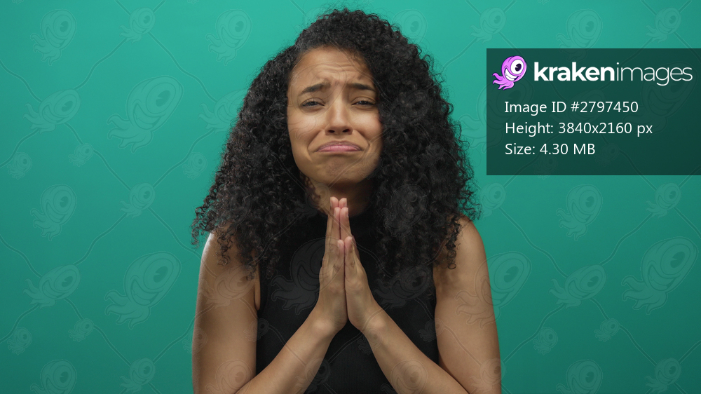 Woman with curly hair and a pleading expression stands alone against a vibrant green background, creating a dramatic scene of emotion and hope.