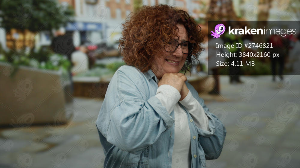 Woman with curly hair appearing worried on a bustling city street with people and greenery, middle-aged and brunette in urban outdoor setting with a concerned expression. - Kraken Images