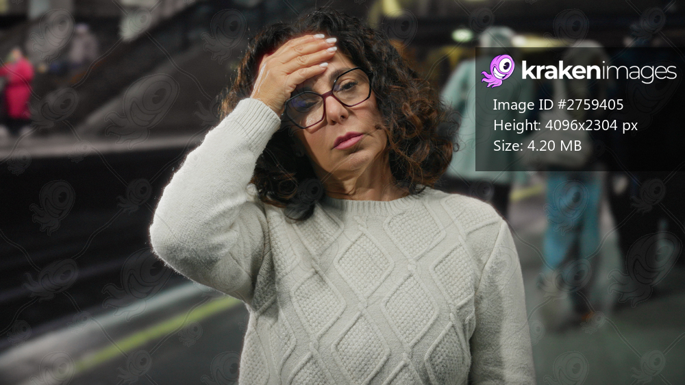 Woman with curly hair appears unwell at indoor train station, holding her head and chest, wearing glasses and sweater while other people walk by in the railway background. - Kraken Images