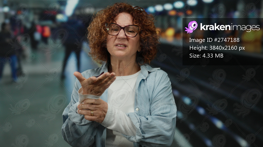 Woman with curly hair at indoor train station holding her wrist in pain, surrounded by a blurry crowd in the background.