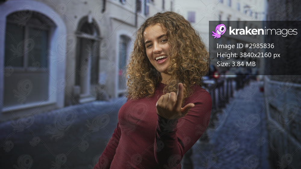 Woman with curly hair beckons with index finger and visible hand, smiling in a burgundy top on a cobblestone street; playful invitation.