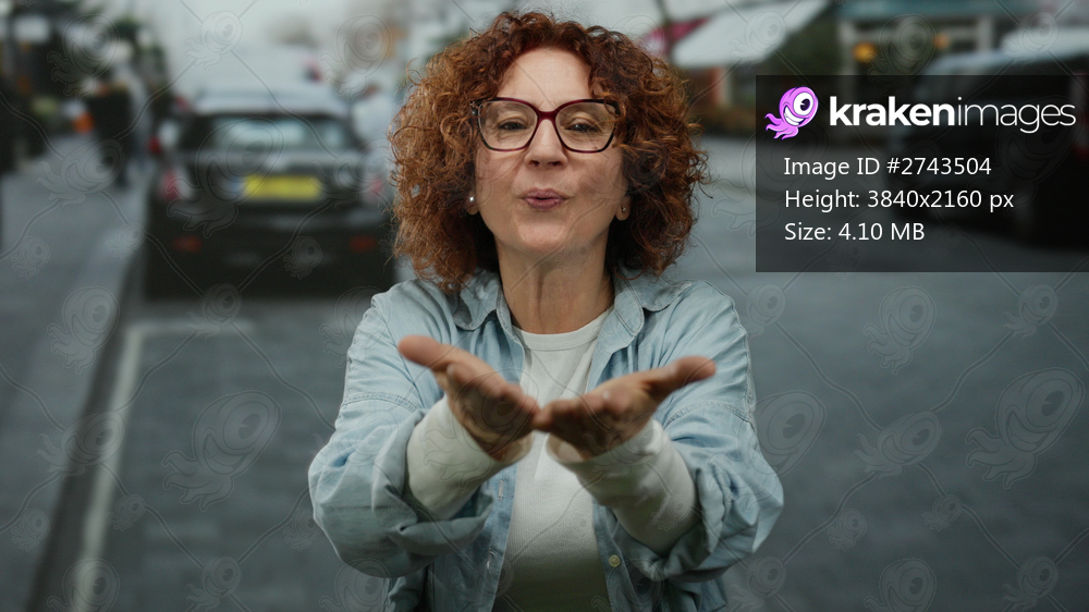 Woman with curly hair blowing kisses on a city street in urban setting wearing glasses and blue shirt surrounded by cars outdoors in daylight.