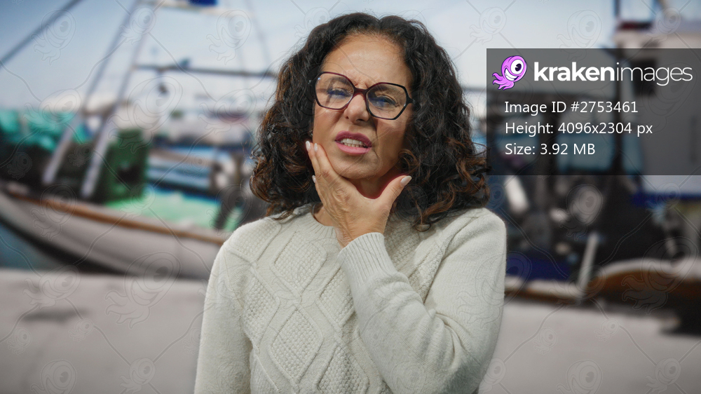 Woman with curly hair by the seaside touching face near boats in port with concerned expression wearing glasses and sweater under sunny outdoor sky.