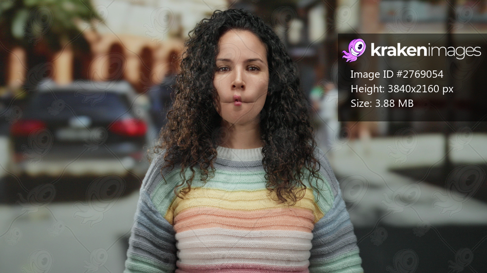 Woman with curly hair and colorful sweater makes expressions on street with cars and blurred buildings in background on a sunny day.