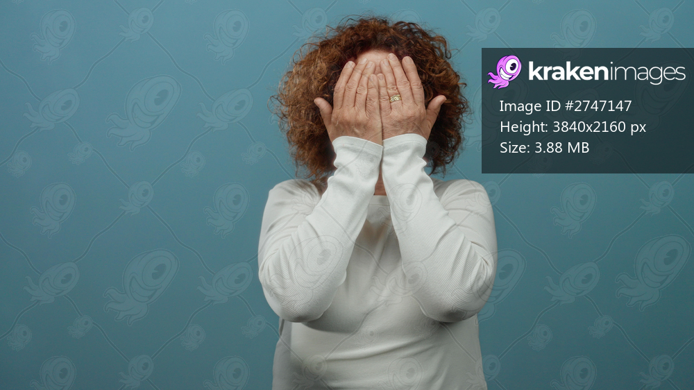 Woman with curly hair covering her eyes then smiling, wearing glasses, over a blue background, isolated middle-aged hispanic demonstrating surprise.