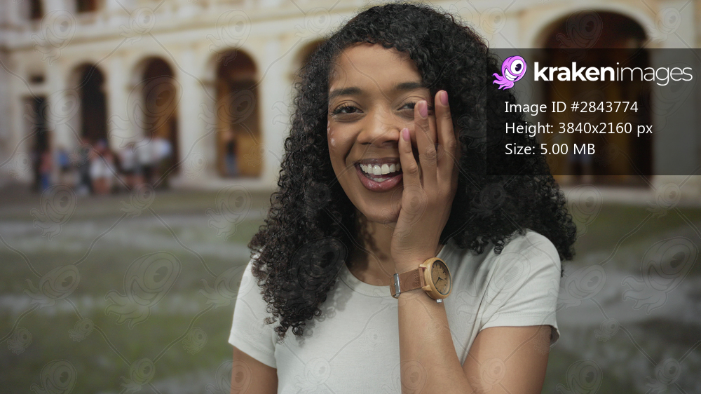 Woman with curly hair covers cheek with hand in a sunny old town street beside stone arches; happiness joy playfulness contentment.
