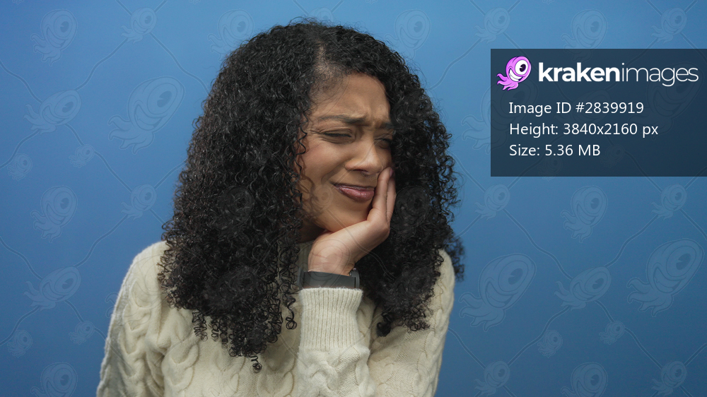 Woman with curly hair and cream sweater holds hand on cheek, eyes closed and lips pressed, for toothache in studio against blue backdrop; pain.