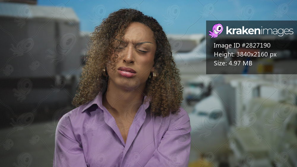 Woman with curly hair crosses arms at airport terminal outdoors under blue sky near boarding gate; rejection.