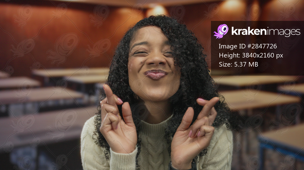 Woman with curly hair crosses her fingers near her face in a wood paneled building interior with warm lighting; hope.